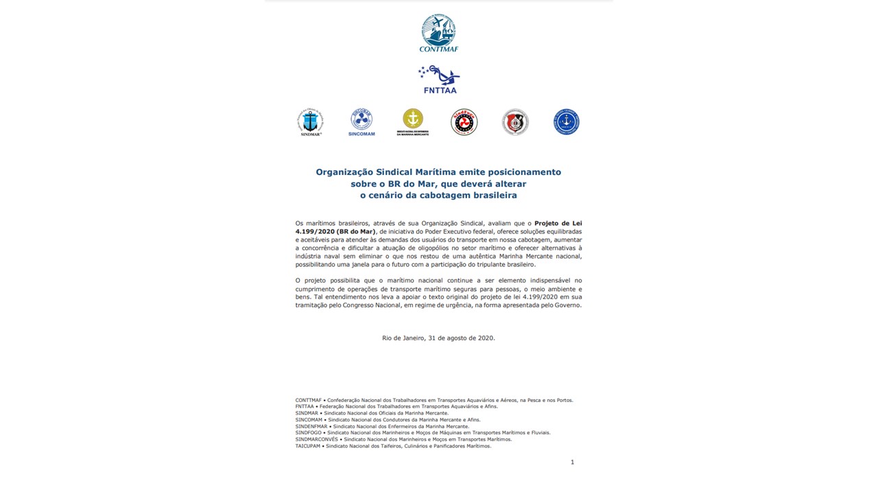 ORGANIZAÇÃO SINDICAL MARÍTIMA EMITE POSICIONAMENTO SOBRE A BR DO MAR, QUE DEVERÁ ALTERAR O CENÁRIO DA CABOTAGEM BRASILEIRA Anterior Próximo